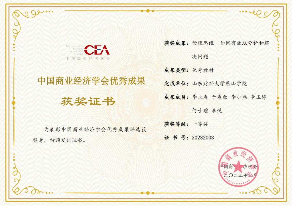 在剛剛結束的中國商業經濟學會2023年度優秀成果評獎活動中,由6776永利集團院長李永春教授主編的教材《管理思維---如何有效地分析和解決問題》榮獲優秀教材一等獎。同時,在8月份進行的山東省第十五屆大學生科技節活動中,6776永利集團李永春、劉金煒指導的學生組榮獲山東省大學生智慧企業管理創新設計大賽數字商業企業模擬經營對抗賽道一等獎。另外,在前不久公布的山東省教育科學研究院組織的2023年度山東省教育教學研究課題...